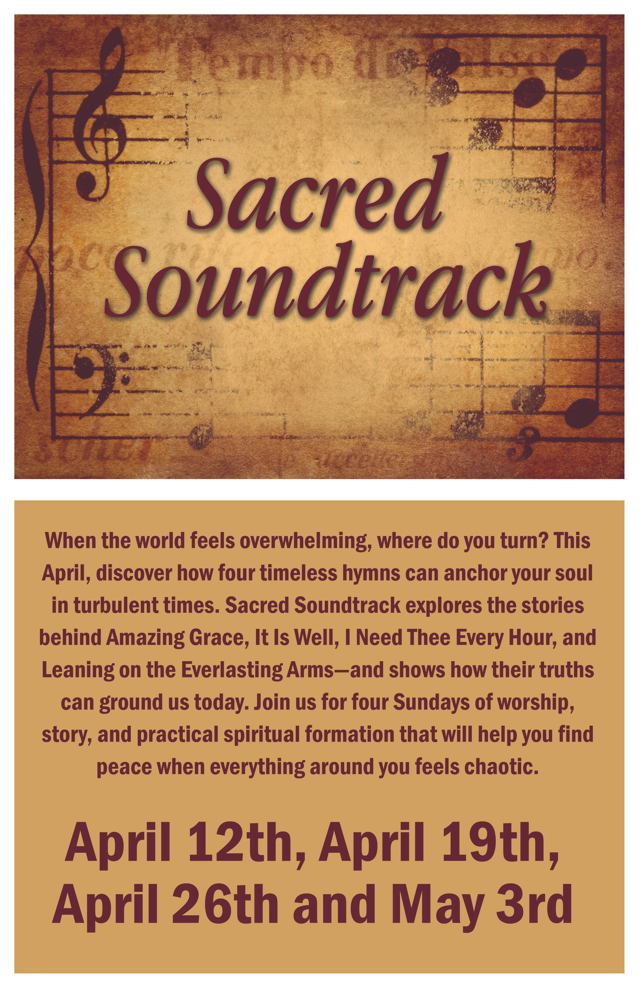 Sacred Soundtrack is a four-week journey through hymns that were forged in crisis. The writers of Amazing Grace, It Is Well, I Need Thee Every Hour, and Leaning on the Everlasting Arms didn't compose from comfort, they wrote from the deep end. And what carried them is what can carry us: not more noise, but a Savior. Not willpower, but spiritual rhythm.